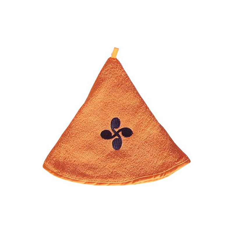 Essuie mains en éponge de couleur orange. Une croix basque de couleur bleu y est brodée.